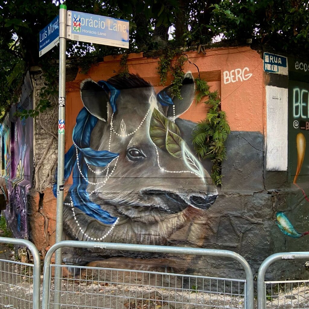 Com tinta acrílica à base de água, spray e pincéis, Berg é reconhecido por pintar animais nativos do Brasil e, com sua arte, chamar atenção para a importância da conservação da biodiversidade brasileira. Uma marca registrada de sua arte está relacionada à valorização da sabedoria da natureza. Nas obras de Berg, os animais são reverenciados, muitos ganham elementos de divindade. Aqui Fernando Berg compartilha um pouco da ideia original do mural.