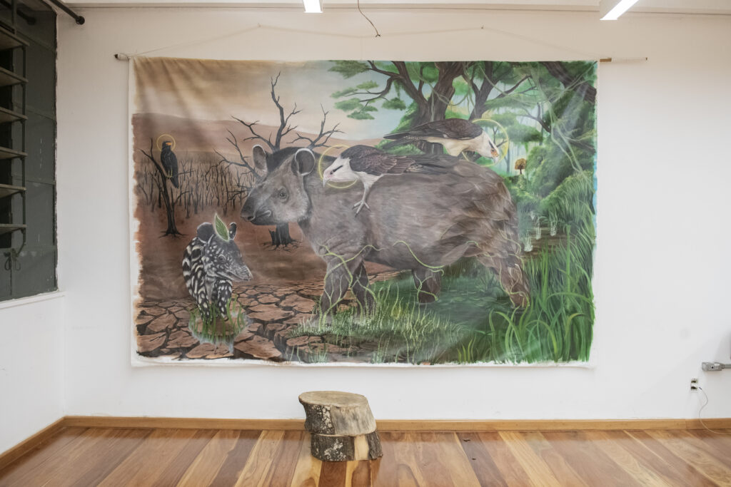 “Na composição, há um mico-leão-preto com o filhote, o adulto está com a patinha levantada na direção da cabeça do mais novo, a ideia é de uma benção (algo ainda muito comum no interior), um gesto de cuidado. Em toda pintura que faço, gosto de colocar o personagem principal, o mais vulnerável geralmente, olhando para o espectador, no caso o filhote de mico-leão-preto, porque ele é o futuro. A ideia é reforçar que é preciso cuidar para ele poder crescer. As duas araras vermelhas estão reverenciando os micos. Já o mico-leão-preto do outro lado do mural convive em harmonia com dois pássaros, um deles está olhando para frente enquanto o outro para cima, para o gambá, a lua. Os pássaros são guias, protetores, o mico está observando e essas aves somam com ele, trocam informação, se protegem”.
