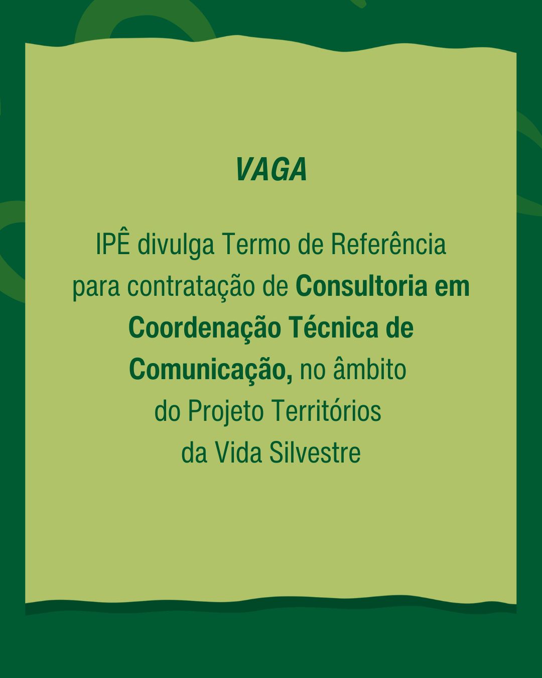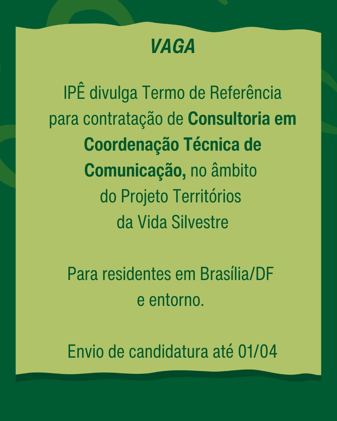 O IPÊ – Instituto de Pesquisas Ecológicas divulga Termo de Referência para contratação de Consultoria em Coordenação Técnica de Comunicação, no âmbito do Projeto Territórios da Vida Silvestre, em conformidade com as regras e políticas institucionais do IPÊ, o Manual Operacional do Projeto (MOP), o Plano de Comunicação e demais normativas aplicáveis. É necessário residir em Brasília ou entorno.