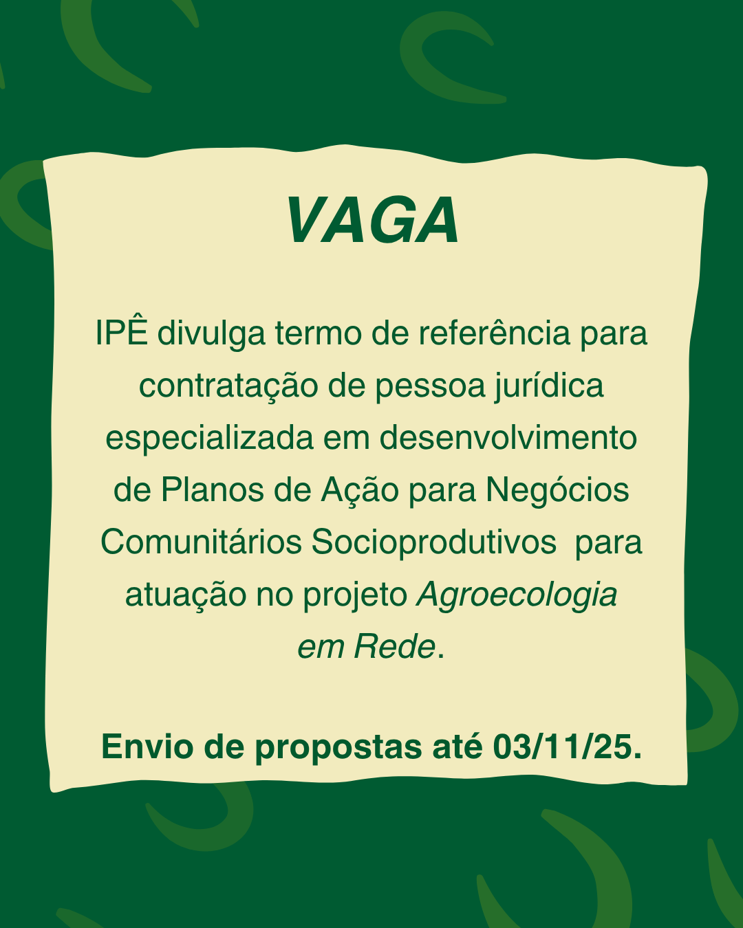 O IPÊ – Instituto de Pesquisas Ecológicas (IPÊ), por meio do Projeto Agroecologia em Rede, abriu termo de referência para a contratação de uma pessoa jurídica especializada na elaboração participativa de Planos de Ação para Negócios Comunitários Socioprodutivos. A prestação de serviços visa atender as associações : Associação de Agricultores da Comunidade São Francisco de Assis – AACSFA e Associação de Produtores Orgânicos Renascer do Careiro da Várzea – ASPRORCAv, ambas localizadas, respectivamente, em Rio Preto da Eva Careiro da Várzea, na região metropolitana de Manaus (AM).